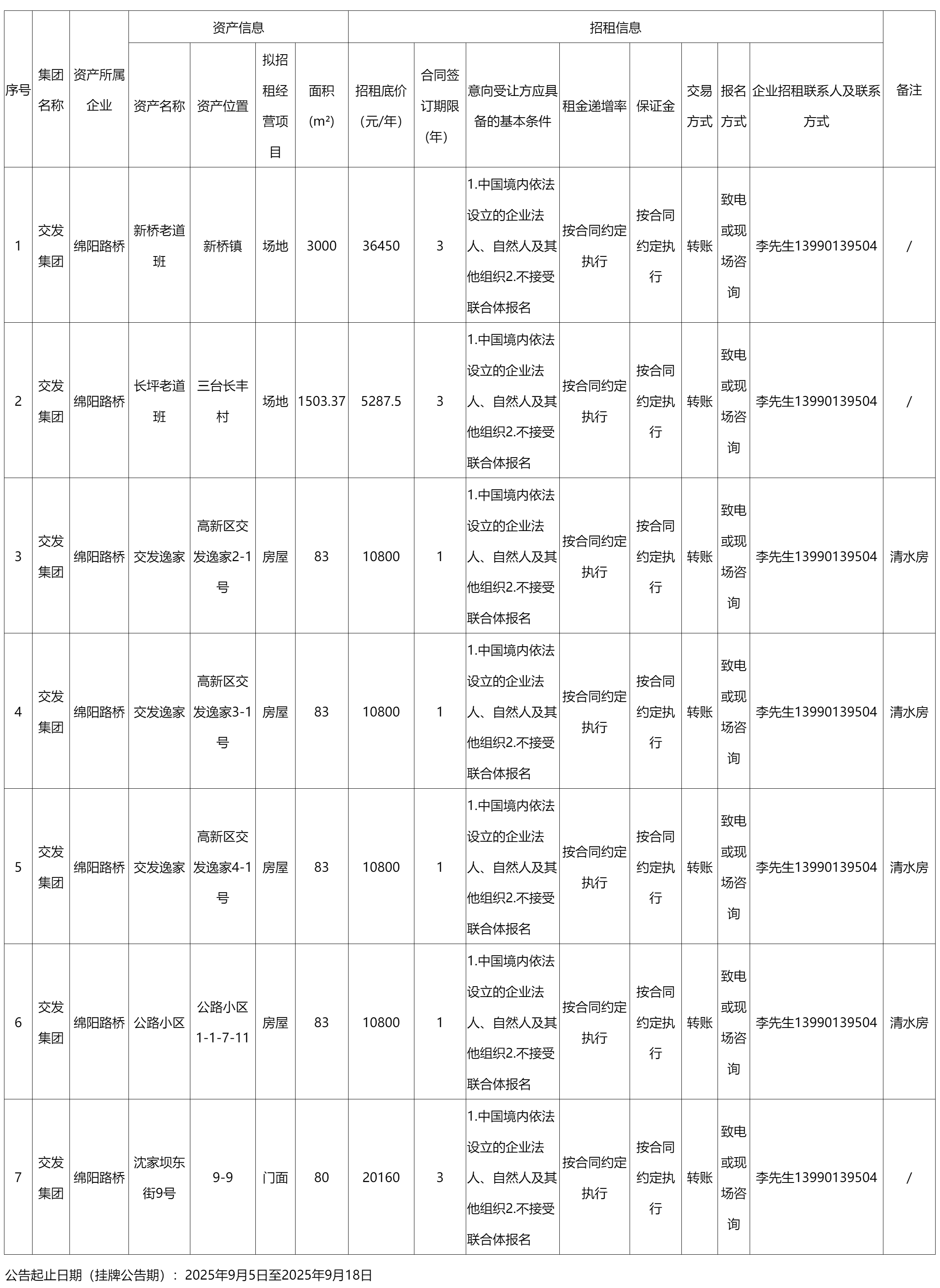 綿陽路橋建設集團有限責任公司資產招租信息公告