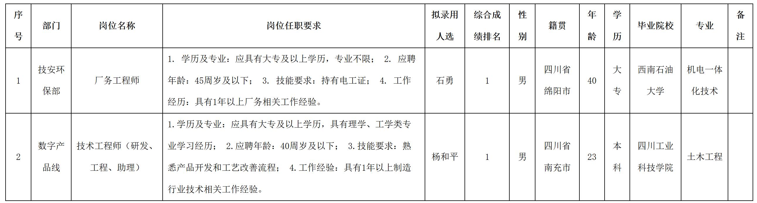 根據四川九州光電子技術有限公司發布的招聘公告及招聘相關規定,經筆試、面試、考察、體檢等程序,擬錄用石勇等2名同志到四川九州光電子技術有限公司工作,現予以公示,具體情況如下: