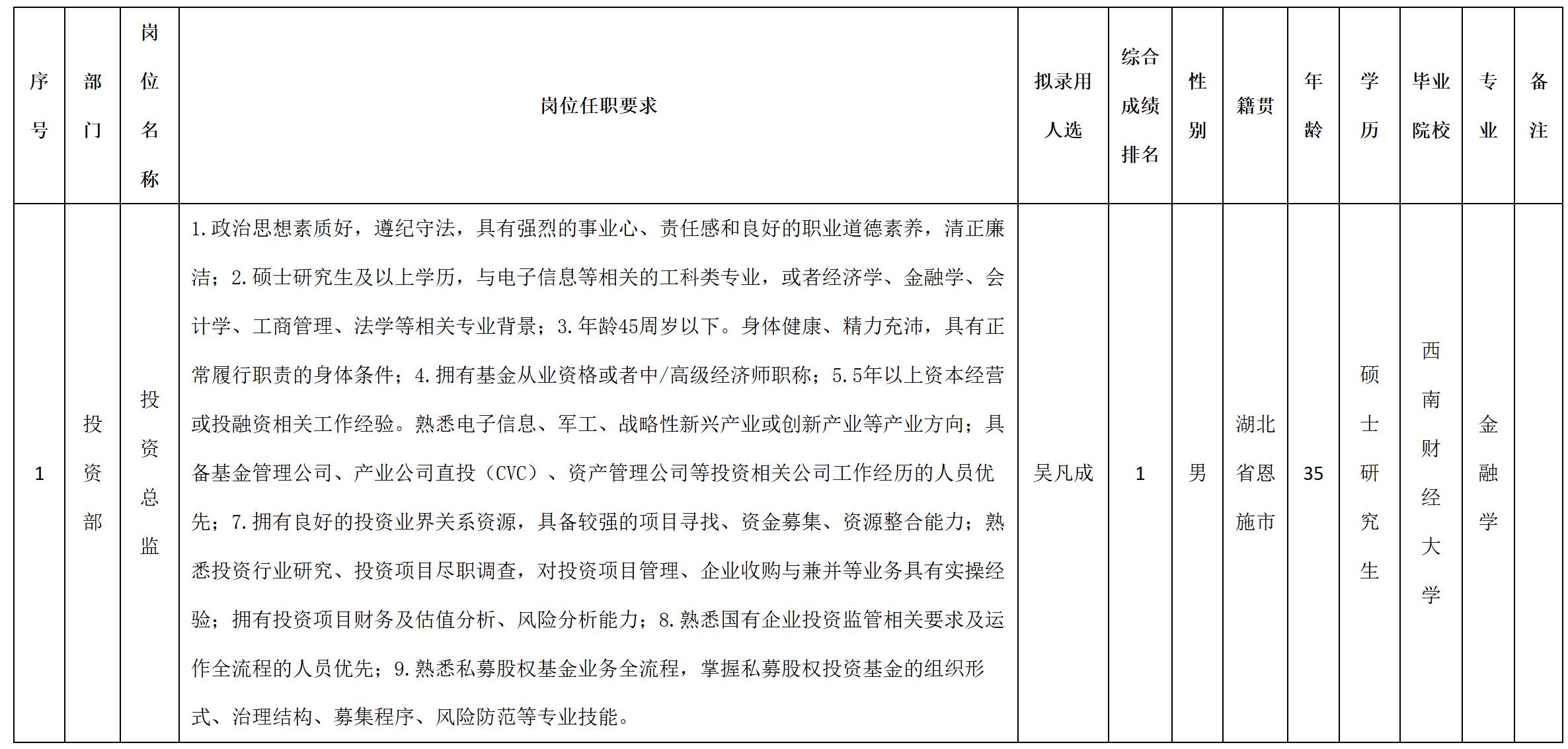 根據四川九洲君合私募基金管理有限公司發布的招聘公告及招聘相關規定,經筆試、面試、考察、體檢等程序,擬錄用吳凡成同志到四川九洲君合私募基金管理有限公司工作,現予以公示,具體情況如下: