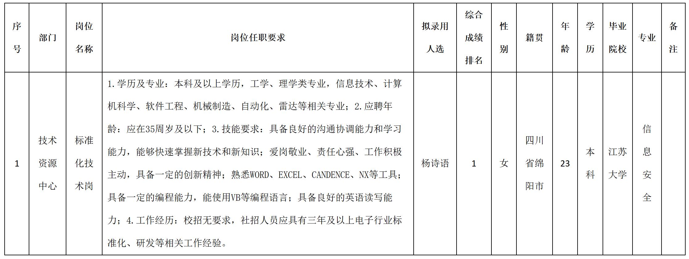 根據四川九洲空管科技有限責任公司發布的招聘公告及招聘相關規定,經筆試、面試、考察、體檢等程序,擬錄用楊詩語同志到四川九洲空管科技有限責任公司工作,現予以公示,具體情況如下:
