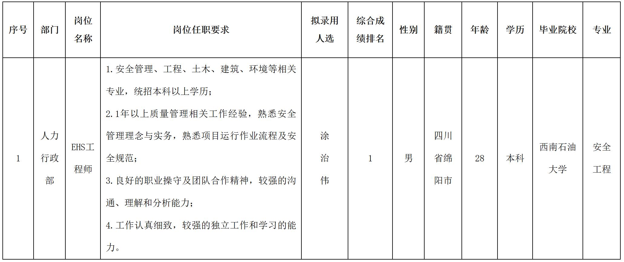 根據四川波鴻實業有限公司發布的招聘公告及招聘相關規定,經面試、體檢等程序,擬錄用涂治偉同志到威斯卡特(綿陽)汽車零部件制造有限公司工作,現予以公示,具體情況如下: