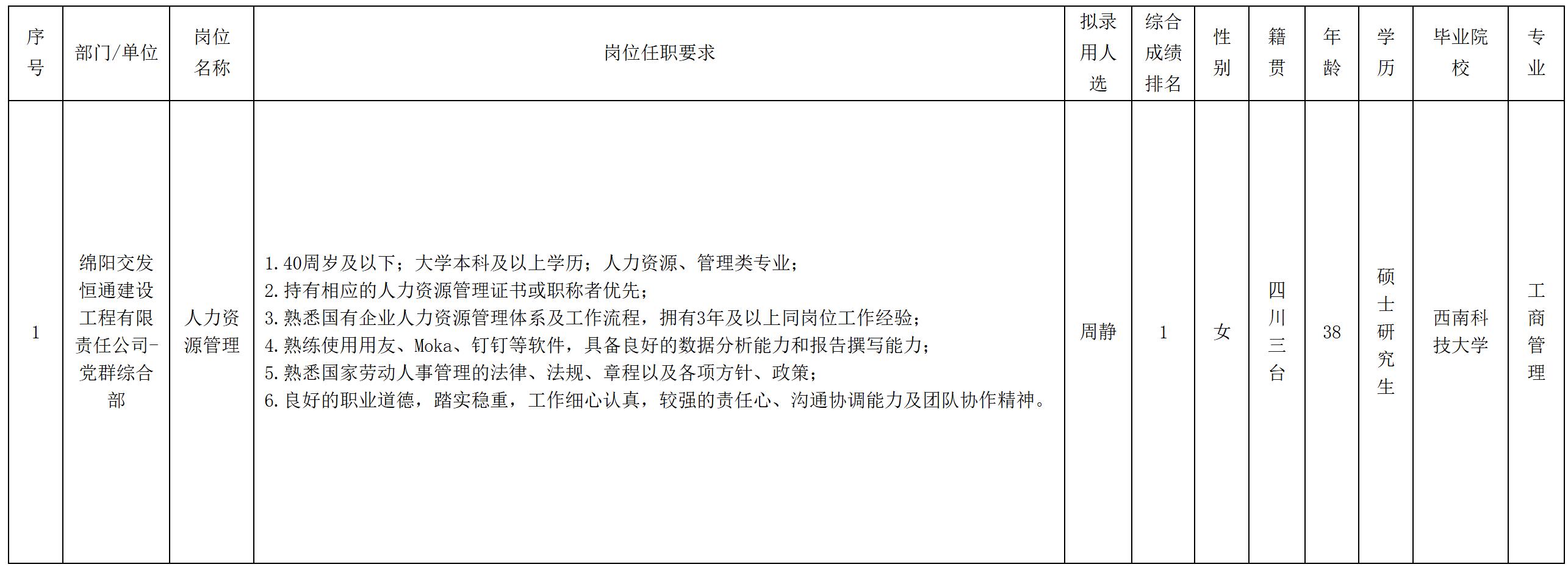 根據(jù)我司發(fā)布的招聘公告及招聘相關(guān)規(guī)定,經(jīng)初試、復(fù)試、體檢、背景調(diào)查等程序,擬錄用周靜同志到綿陽交發(fā)恒通建設(shè)工程有限責(zé)任公司工作,現(xiàn)予以公示,具體情況如下: