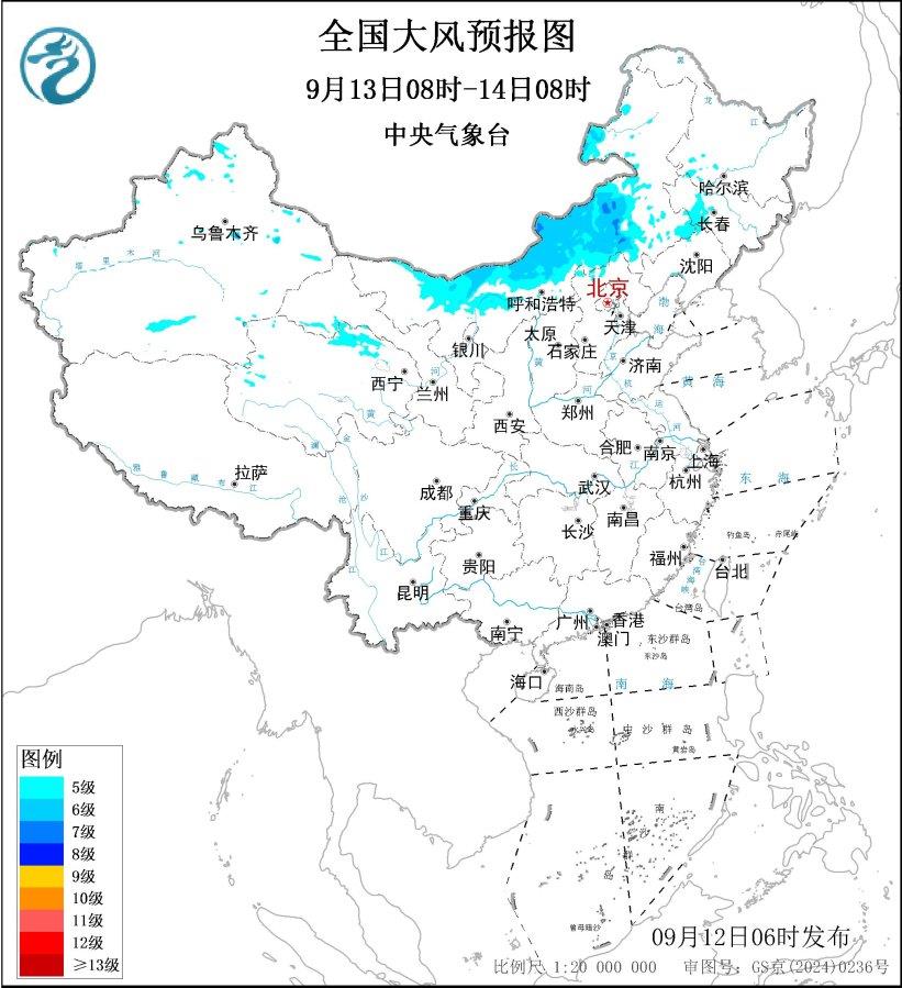 預計,9月12日8時至13日8時,新疆東部、甘肅西部、內蒙古西部和東北部、黑龍江中南部、吉林中部等地部分地區將有4~6級風;黃海中部和南部海域將有7~8級、陣風9級的大風,其中部分海域風力可達9級、陣風10級。