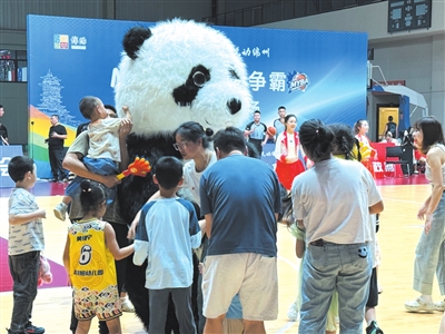 “哇,快看,好大一只大熊貓!”比賽尚未開(kāi)始,伴隨拉拉隊(duì)熱場(chǎng)舞蹈的火熱開(kāi)場(chǎng),一只巨大的“大熊貓”也從場(chǎng)邊蹦蹦跳跳地走向球場(chǎng)。這只高近3米的“大熊貓”像是從漫畫(huà)里蹦出來(lái)的,圓滾滾的肚子隨著步伐輕輕晃動(dòng),連走路姿勢(shì)都不自覺(jué)地變成了“熊貓搖擺”。別看它體型龐大,活動(dòng)起來(lái)卻相當(dāng)靈活,不僅可以隨著音樂(lè)的節(jié)奏擺出各種造型,還走向觀眾席張開(kāi)雙臂主動(dòng)向大家求抱抱,吸引了不少球迷上前圍觀合影。到了中場(chǎng)休息環(huán)節(jié),家長(zhǎng)們更是帶著孩子將“大熊貓”團(tuán)團(tuán)圍住,現(xiàn)場(chǎng)氣氛十分有趣。