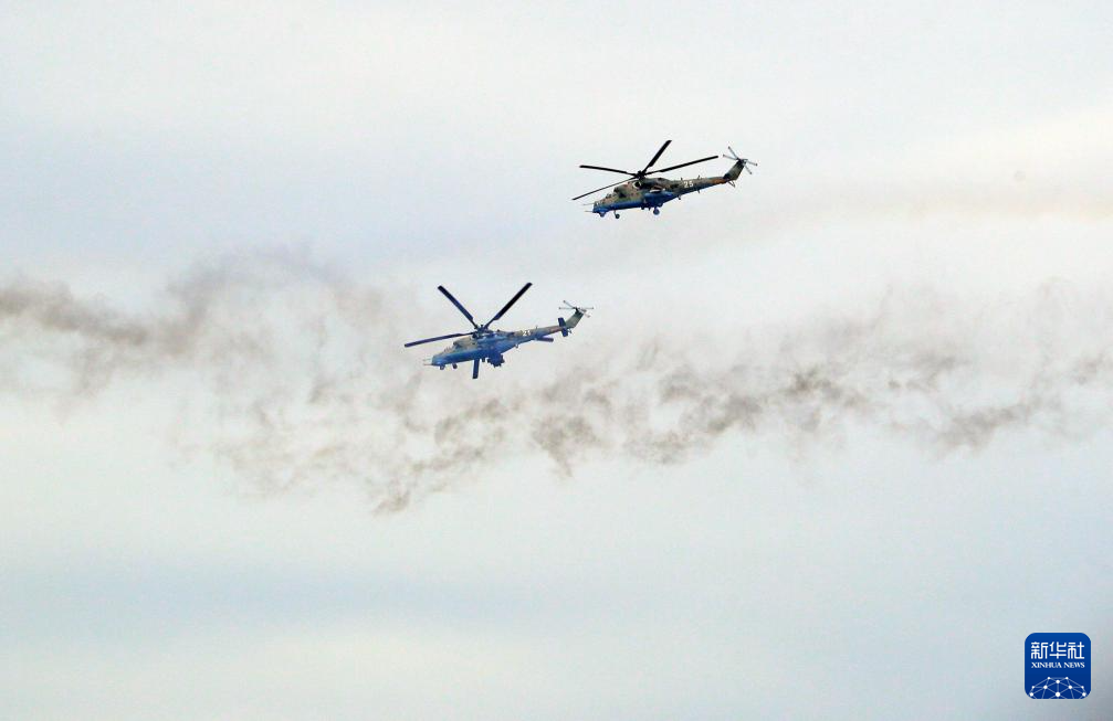 這是9月15日在白俄羅斯明斯克州拍攝的俄白“西部-2025”聯合戰略演習現場的直升機。新華社發(任科夫攝)