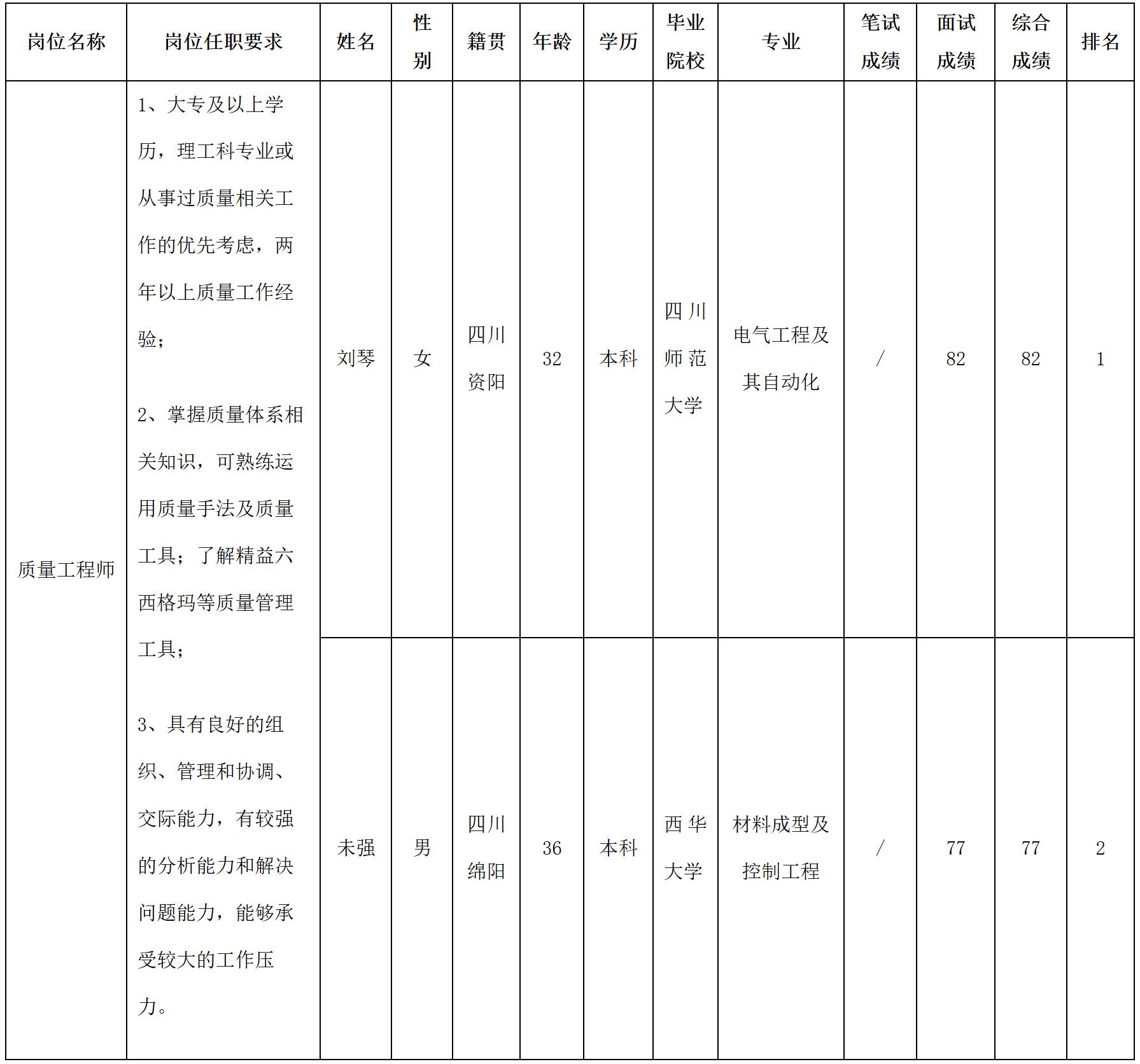 根據四川華豐科技股份有限公司發布的招聘公告及招聘相關規定,經筆試、面試等程序,現將筆試(面試)成績予以公示。