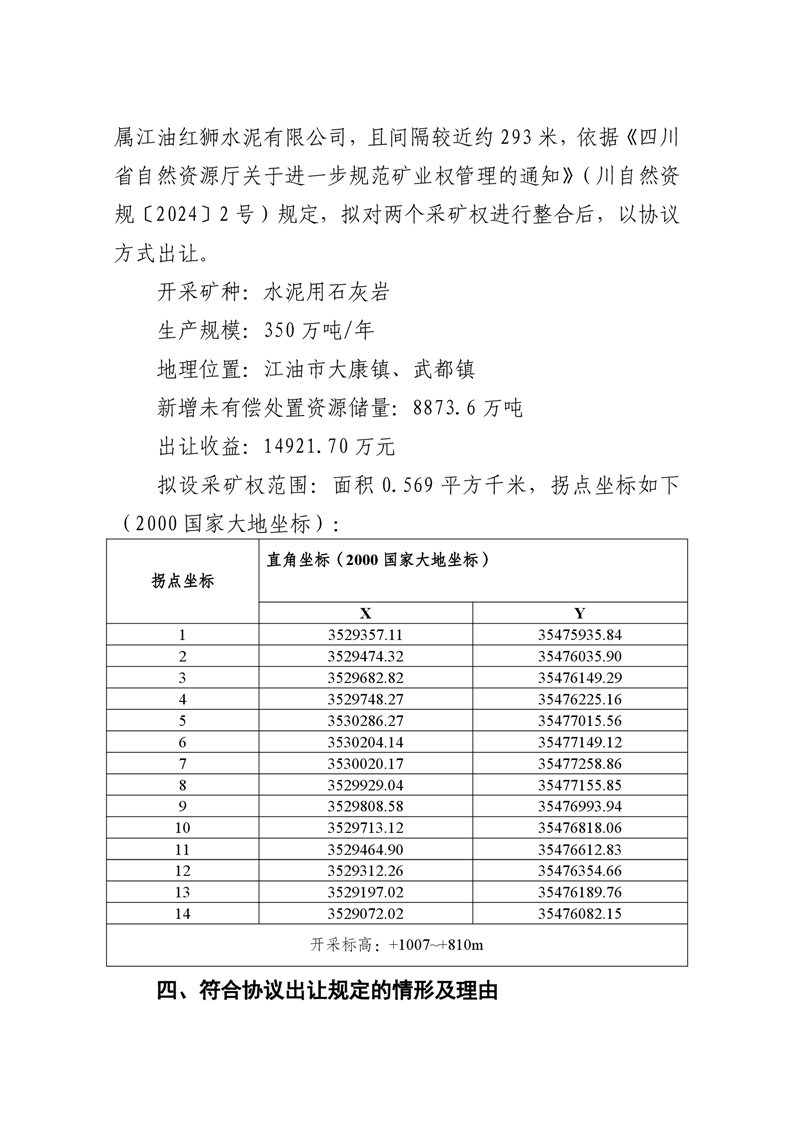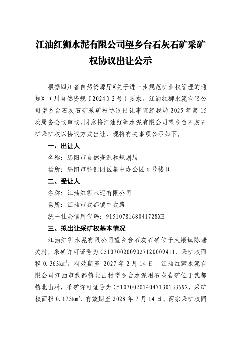 江油紅獅水泥有限公司望鄉臺石灰石礦采礦權協議出讓公示