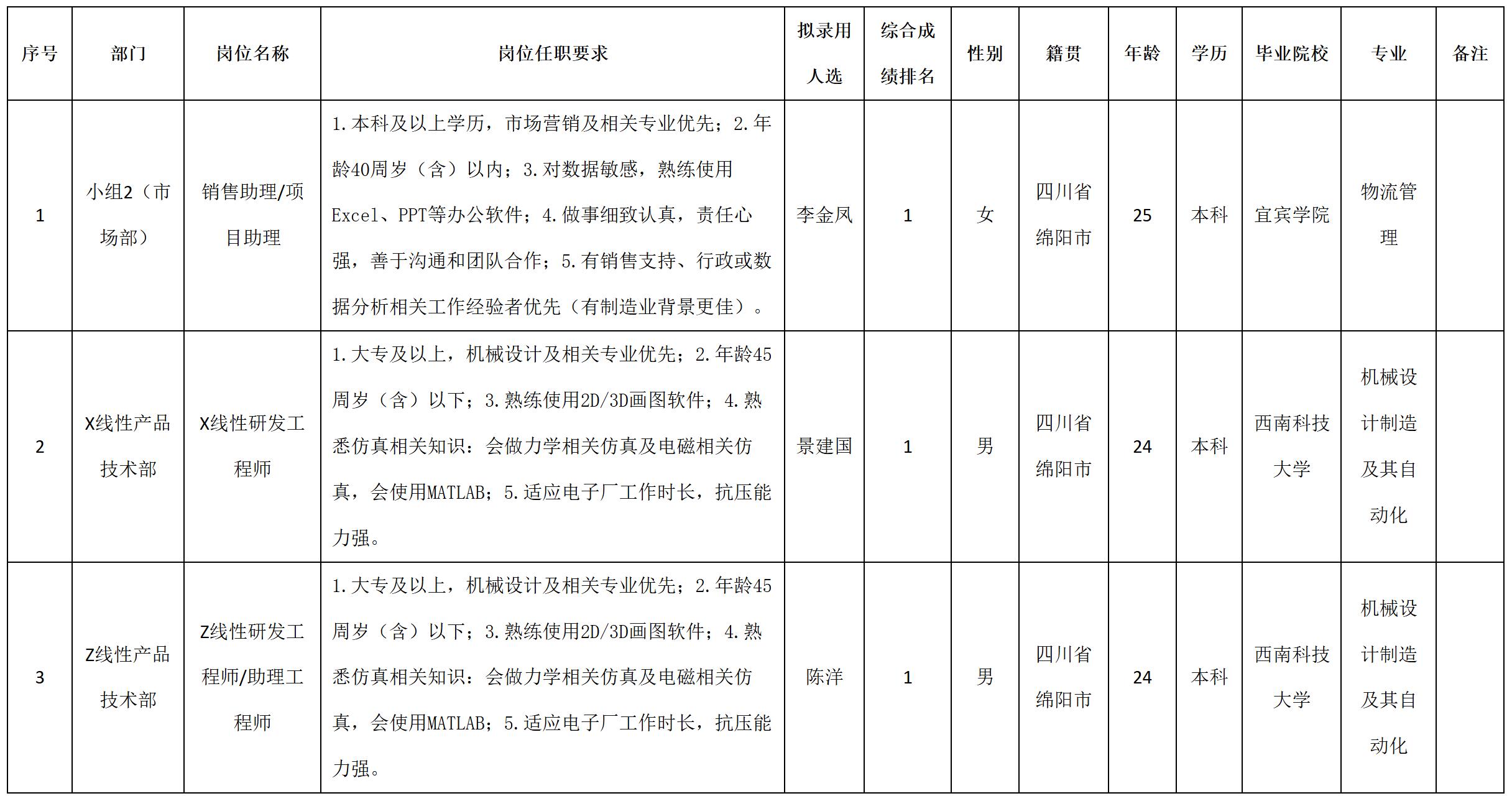 根據四川安和精密電子電器股份有限公司發布的招聘公告及招聘相關規定,經筆試、面試、考察、體檢等程序,擬錄用李金鳳等3名同志到四川安和精密電子電器股份有限公司工作,現予以公示,具體情況如下: