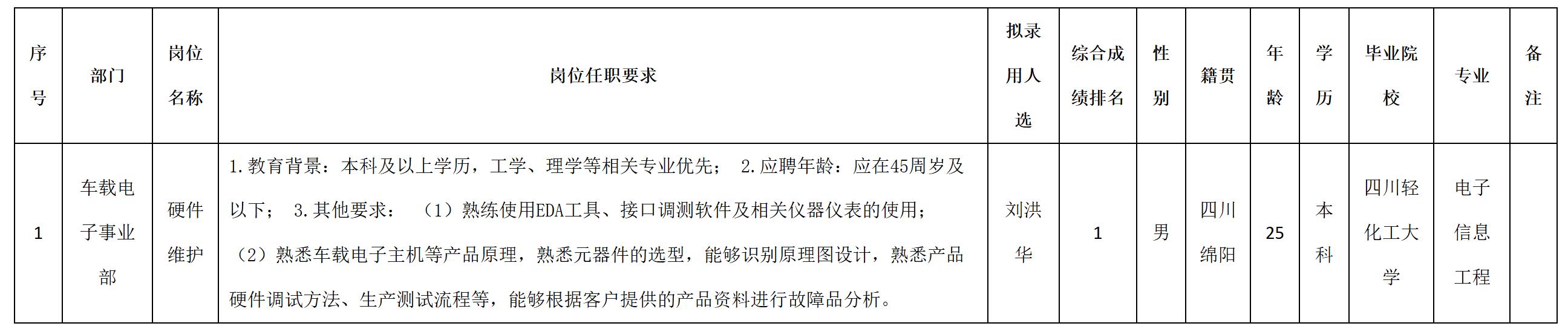 根據四川九州電子科技股份有限公司發布的招聘公告及招聘相關規定,經筆試、面試、考察、體檢等程序,擬錄用劉洪華同志到四川九州電子科技股份有限公司工作,現予以公示,具體情況如下: