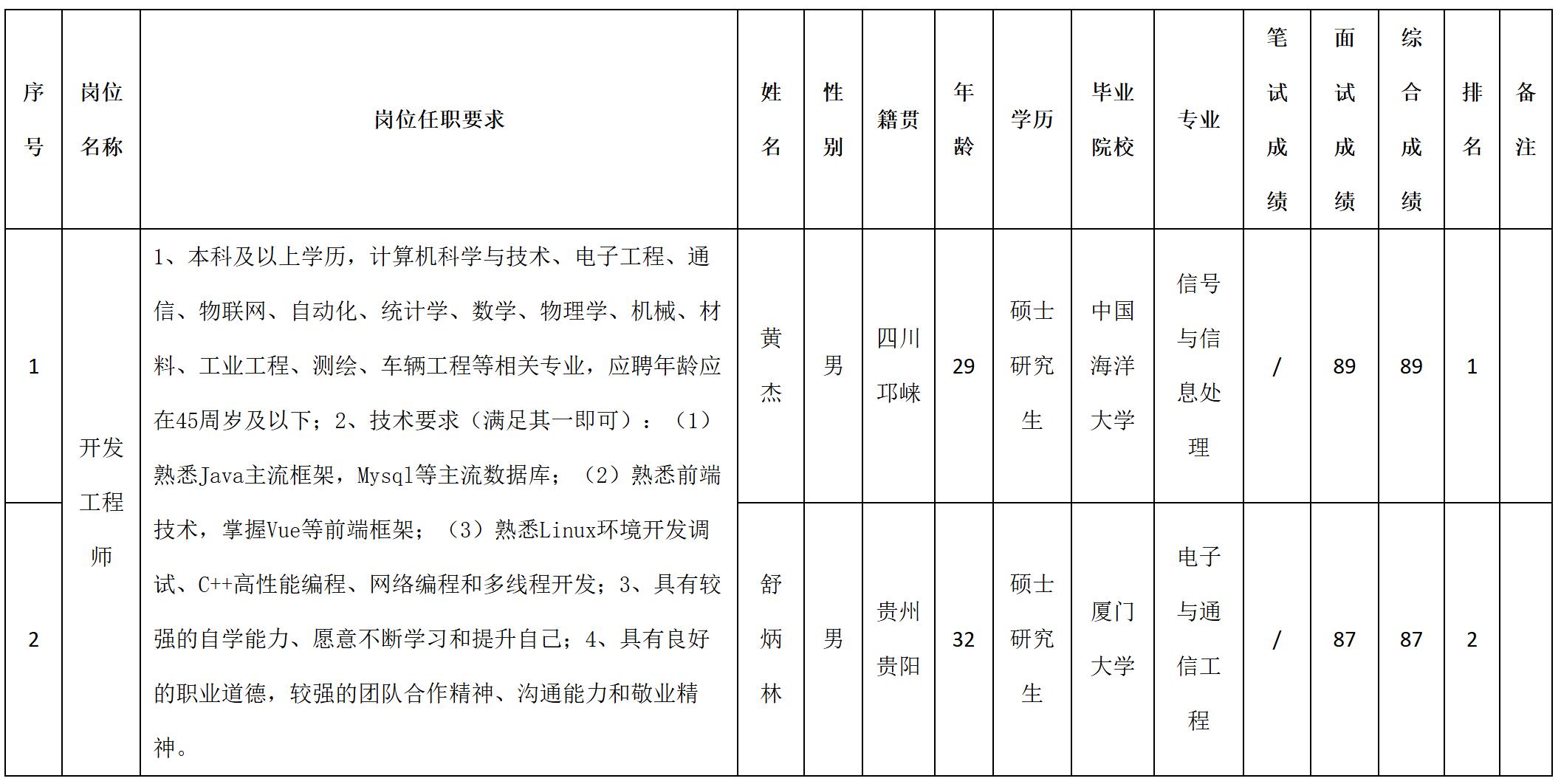 根據四川九洲投資控股集團有限公司軟件與數據智能軍團發布的招聘公告及招聘相關規定,經筆試、面試等程序,現將筆試(面試)成績予以公示。