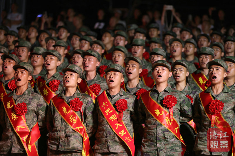 演出結束后,新兵們整齊列隊,高唱軍歌《當那一天來臨》——“準備好了嗎,士兵兄弟們,當那一天真的來臨……”鏗鏘有力的歌聲回蕩在劇場,表達了他們保家衛國、奮勇前進的堅定信念。