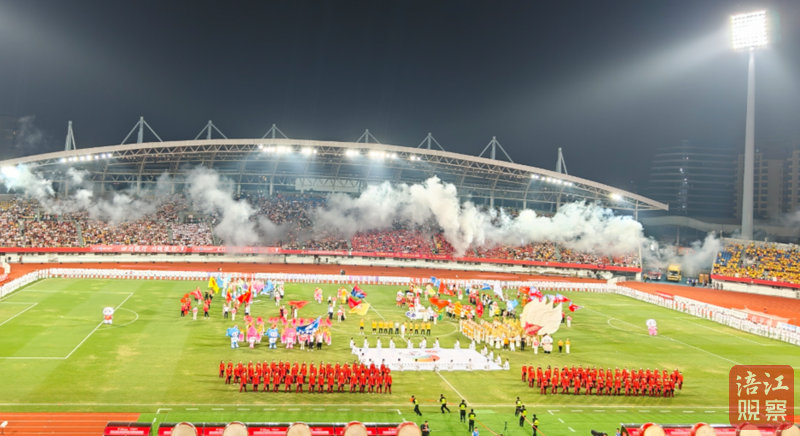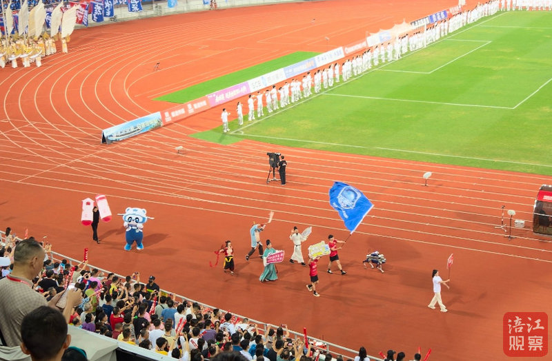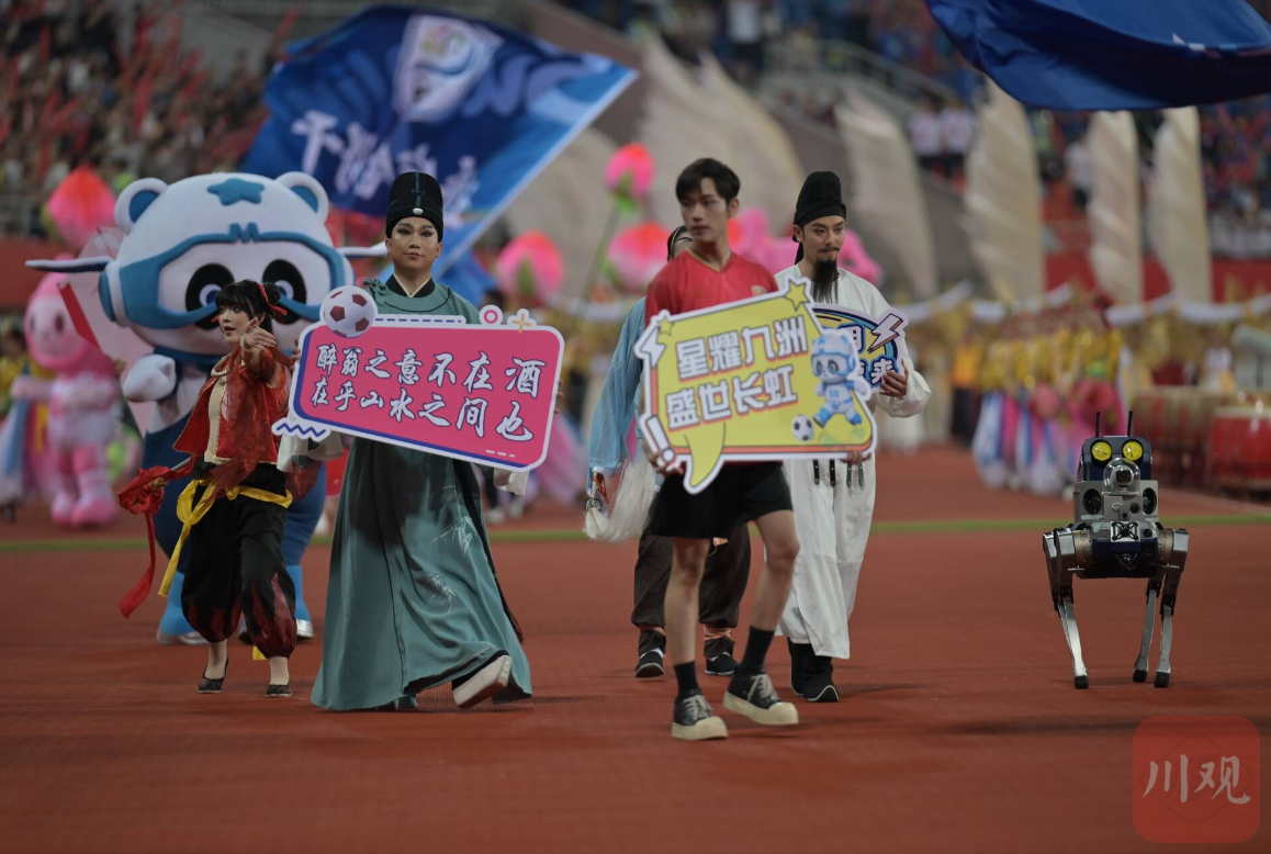 入場完畢后,綿陽特色方隊再次呼喊“星耀九洲 盛世長虹”口號,并配合各自角色的標志性動作定格。這一刻,整個球場仿佛被點燃了一般,氣氛熱烈到了極點。