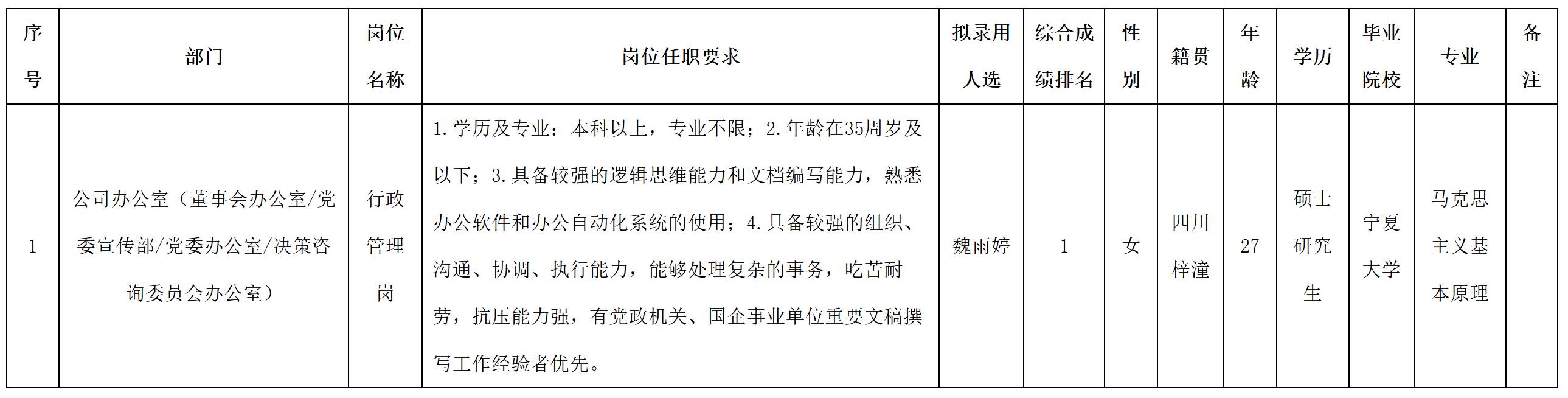 根據四川九洲投資控股集團有限公司發布的招聘公告及招聘相關規定,經筆試、面試、考察、體檢等程序,擬錄用魏雨婷同志到四川九洲投資控股集團有限公司工作,現予以公示,具體情況如下: