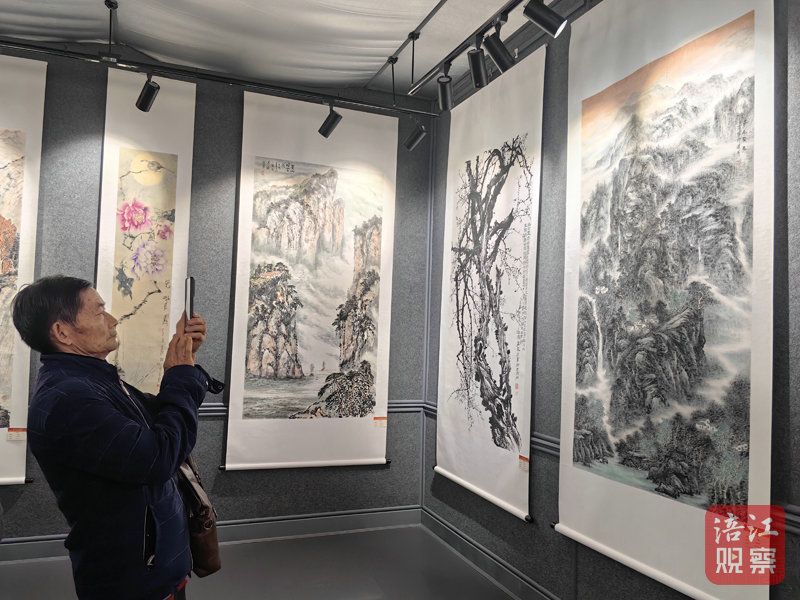 展覽現場,時有參觀者拿出手機在各自喜歡的作品前合影留念,有的與參展作者進行藝術交流,畫家吳映強應邀對展出作品的構思、技法、內容表達等進行現場點評,吸引了大家圍觀。