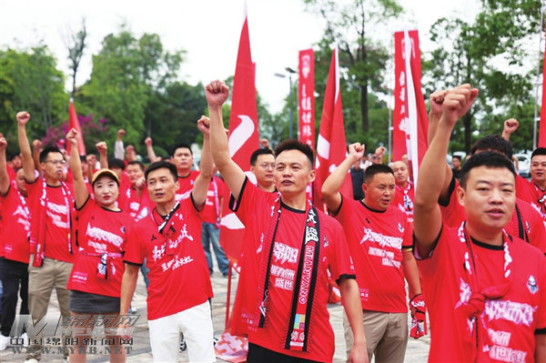 200余名球迷聯盟成員身著紅色助威服,揮舞隊旗齊聲高呼“綿陽九洲長虹隊,雄起!雄起!雄起!”