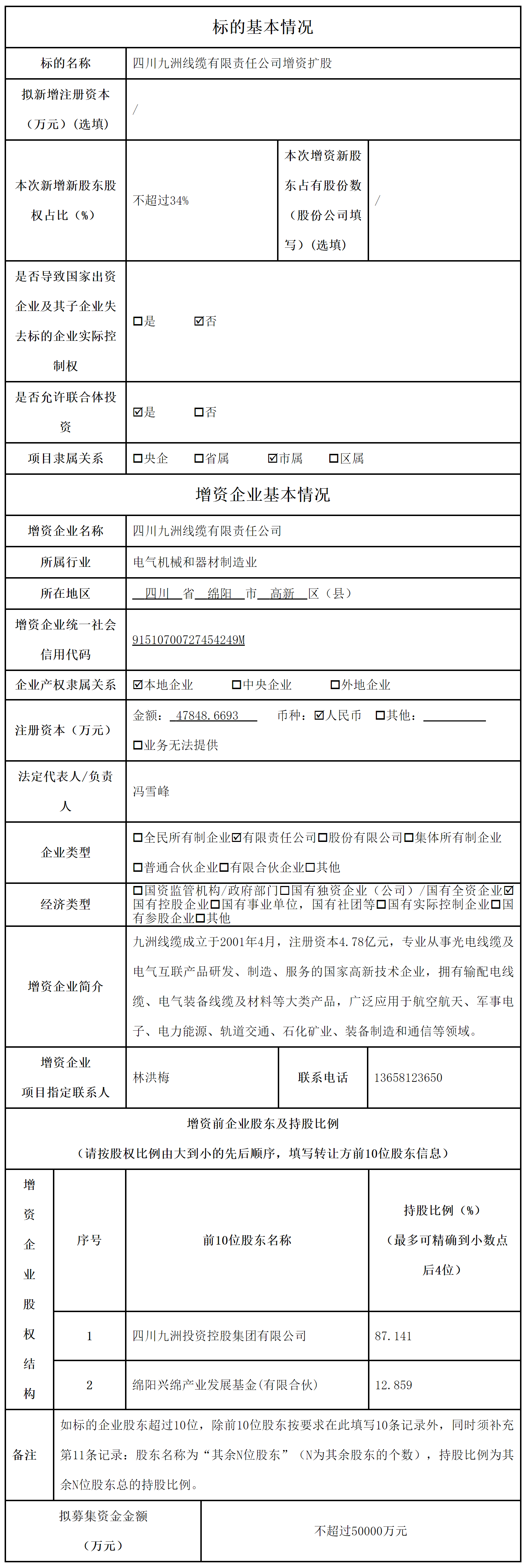 四川九洲線纜有限責任公司增資擴股項目信息預披露