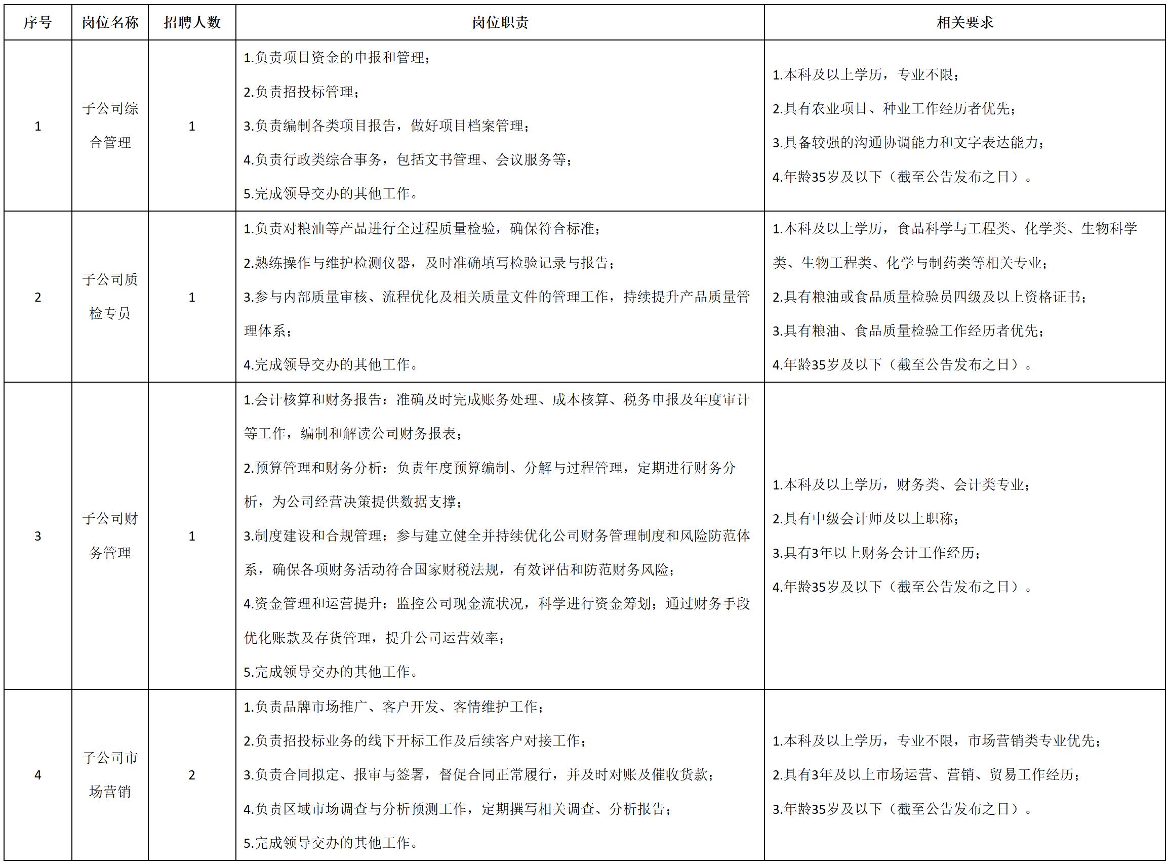 為進一步推動集團業務開展,充實集團現階段發展急需的人才隊伍,按照公開、平等、競爭、擇優的原則,綿糧集團現面向社會公開招聘工作人員5名,具體公告如下: