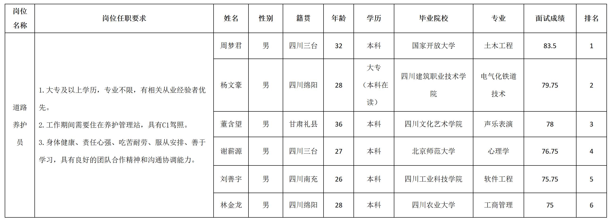 根據2025年退役軍人就業服務專項行動——“戎耀歸蜀”綿陽退役軍人及軍屬招聘活動及綿陽路橋建設集團有限責任公司招聘相關規定,經面試程序,現將面試成績予以公示。
