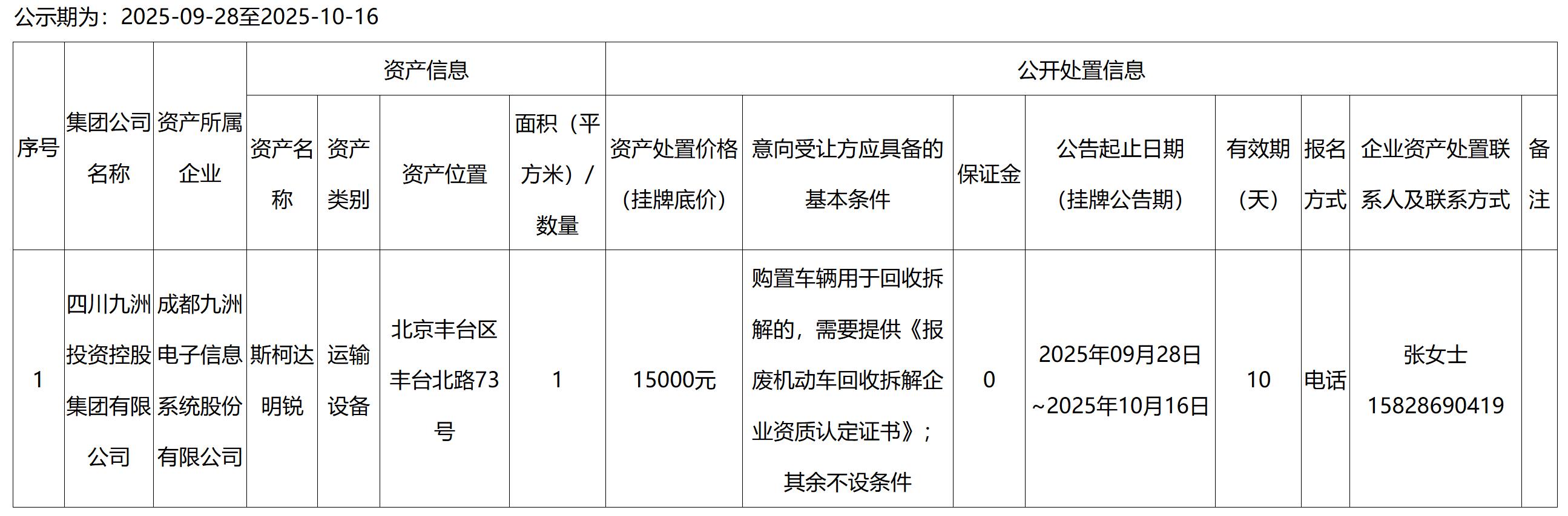成都九洲電子信息系統股份有限公司北京車輛處置公告