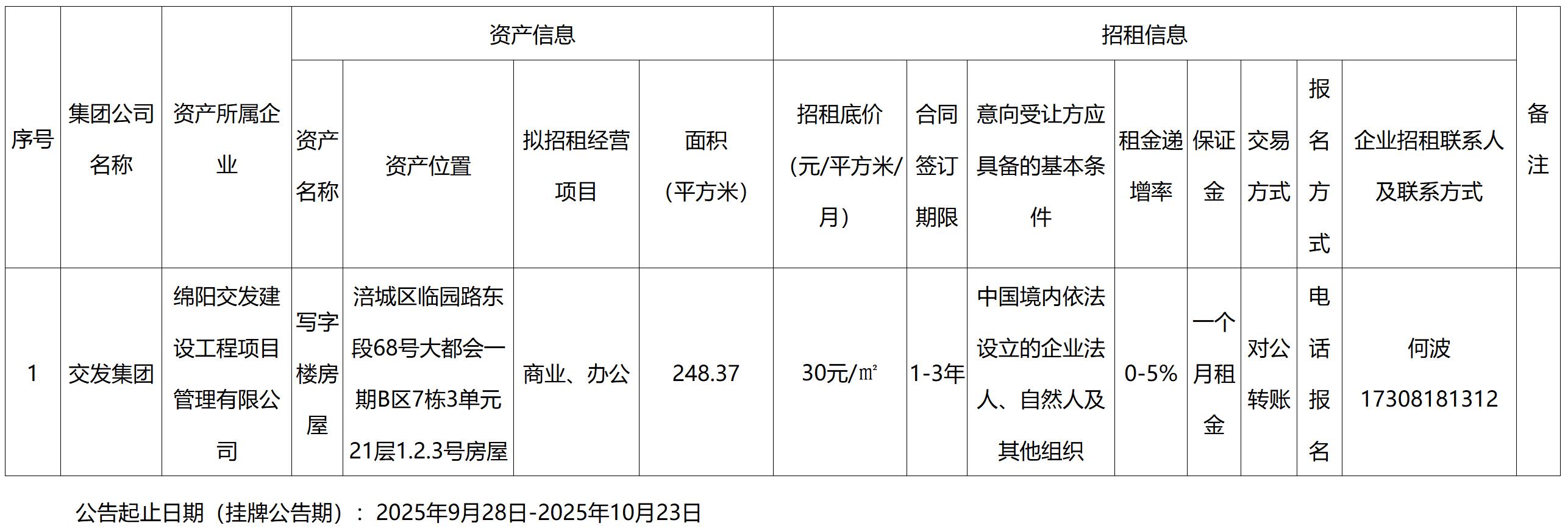 綿陽交發(fā)建設(shè)工程項目管理有限公司經(jīng)營性資產(chǎn)招租公告
