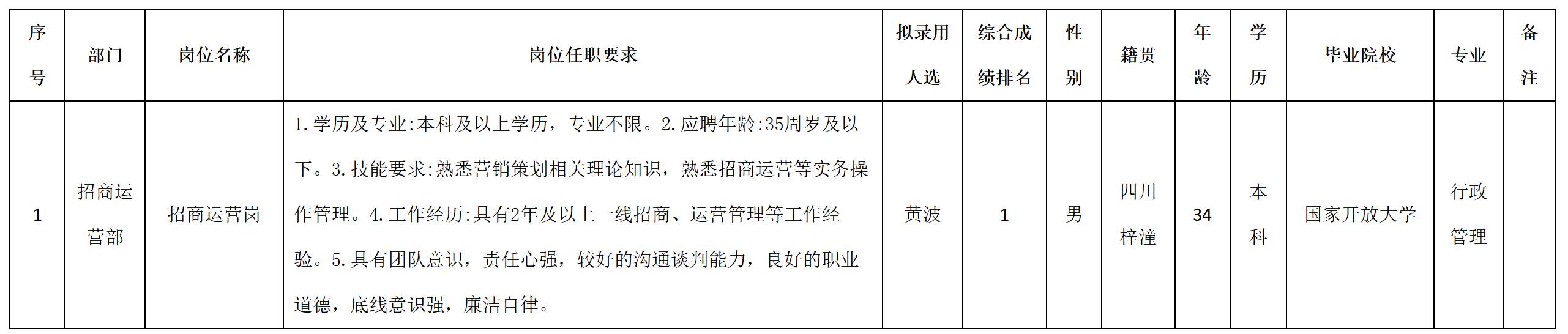 根據四川九洲千城商業管理有限公司發布的招聘公告及招聘相關規定,經測試、考察、體檢等程序,擬錄用黃波同志到四川九洲千城商業管理有限公司工作,現予以公示,具體情況如下: