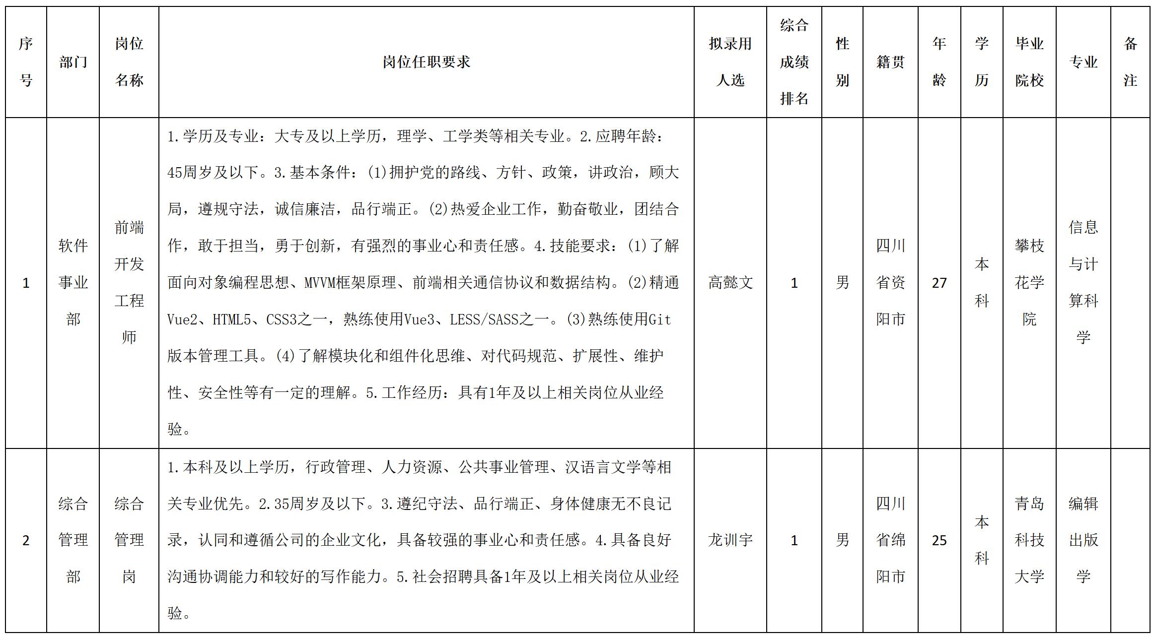 根據四川九強通信科技有限公司發布的招聘公告及招聘相關規定,經測試、考察、體檢等程序,擬錄用高懿文等2名同志到四川九強通信科技有限公司工作,現予以公示,具體情況如下: