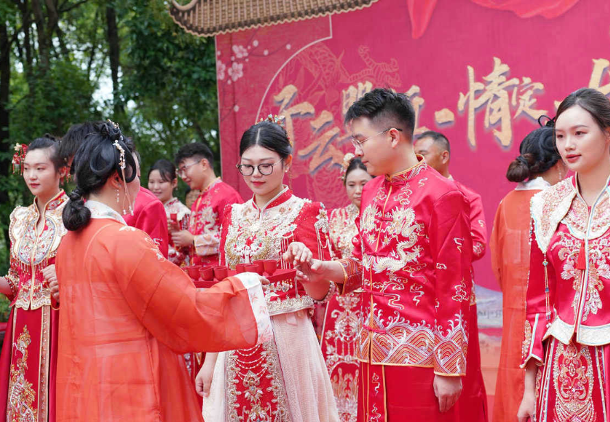 撒喜豆、沃盥禮、合巹禮、結發禮……8月28日,在綿陽市西山公園子云亭下,“子云盟誓·情定西山”紅色背景板鮮艷奪目,20對新人以簡約而莊重的儀式,踐行婚俗新風,開啟婚姻幸福新篇章。[