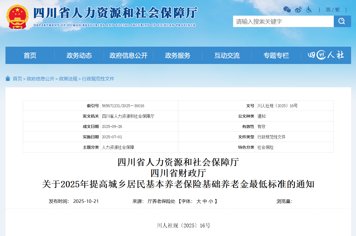日前,四川省人力資源和社會保障廳、四川省財政廳發布關于2025年提高城鄉居民基本養老保險基礎養老金最低標準的通知。[