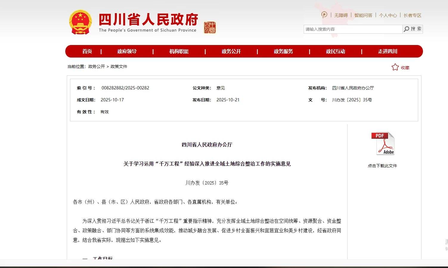 10月21日,四川省人民政府辦公廳印發《關于學習運用“千萬工程”經驗深入推進全域土地綜合整治工作的實施意見》(以下簡稱《實施意見》),旨在充分發揮全域土地綜合整治效能,推動城鄉融合發展、促進鄉村全面振興與宜居宜業和美鄉村建設。《實施意見》為未來幾年四川全域土地..[